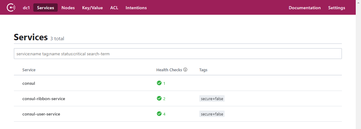 - 运行两个consul-user-service和一个consul-ribbon-service,在Consul页面上可以看到如下信息: