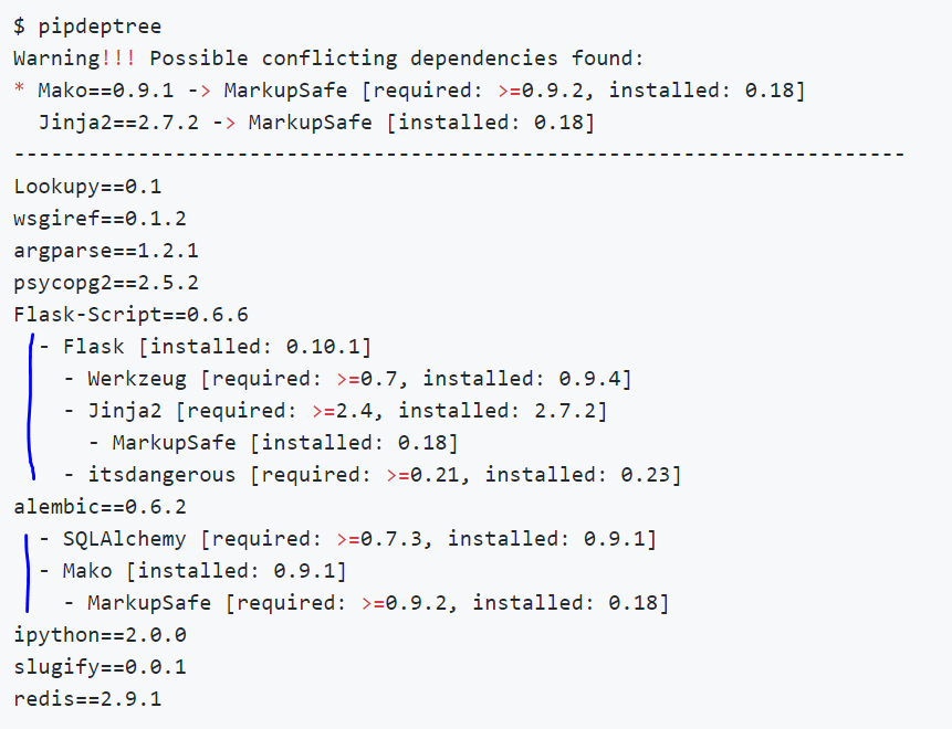 它也有缺点,比如无法穿透虚拟环境。如果要在虚拟环境中工作,必须在该虚拟环境中安装 pipdeptree。因为跨虚拟环境会出现重复或冲突等情况,因此需要限定虚拟环境。但是每个虚拟环境都安装一个 pipdeptree,还是挺让人难受的。