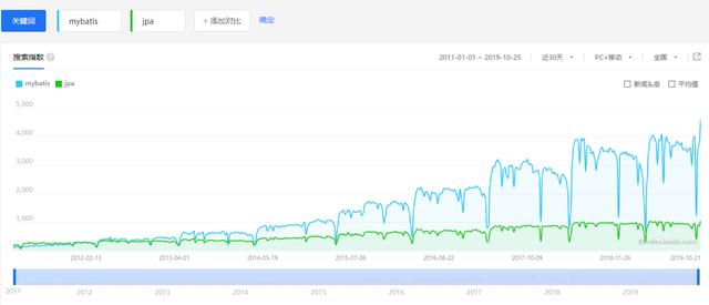 笔者在学习这两个框架的过程中,看过不少的帖子,每当有帖子比较这两个框架的优缺点,就引来一场论战。从笔者的角度,为什么国内的开发人员或者开发团队较少使用JPA?为了避免有人抨击我,我特意去做了一下国内某度指数搜索,这个数据骗不了人。