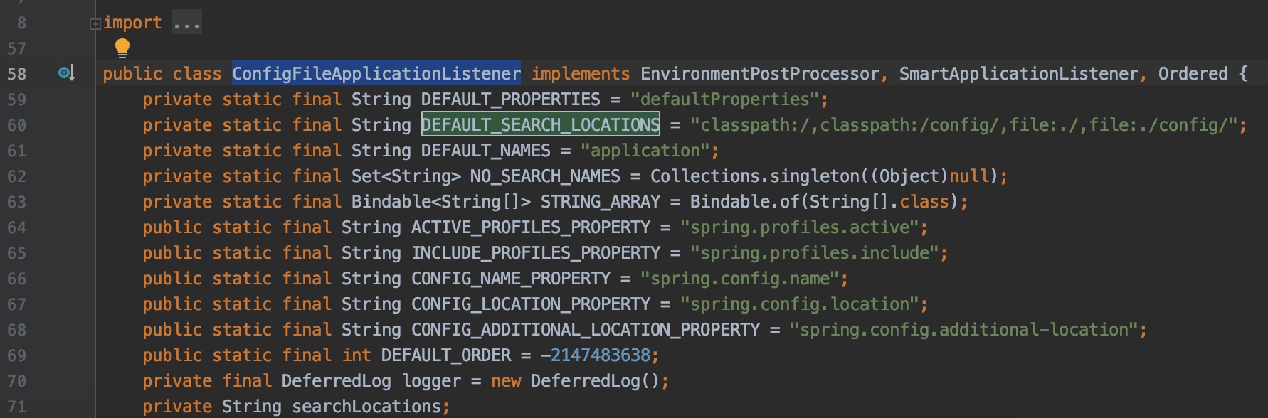 我检查完配置文件和目录,仍然报这个错,只有去代码里找答案。在ConfigFileApplicationListener类中,可以看到 DEFAULT_SEARCH_LOCATIONS 默认加载位置有:“classpath:/,classpath:/config/,file:./,file:./config/”,DEFAULT_NAMES 默认配置文件名:“application”