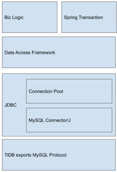 如上图所示,应用可能使用 Spring Transaction 来管理控制事务非手工启停,通过类似 MyBatis 的数据访问框架管理生成和执行 SQL,通过连接池获取已池化的长连接,最后通过 JDBC 接口调用实现通过 MySQL 协议和 TiDB 完成交互。