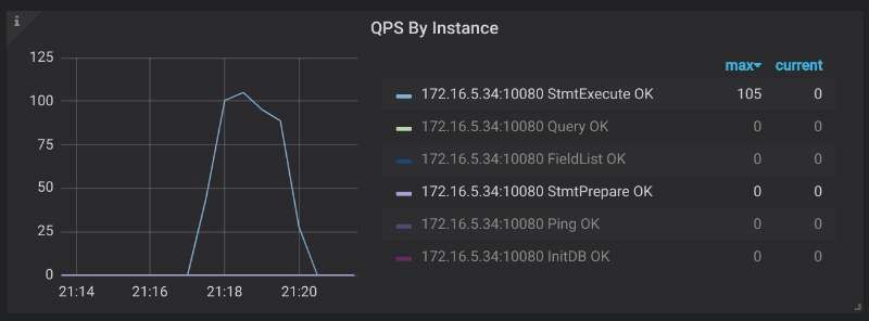在 TiDB 监控中可以通过 Query Summary > QPS By Instance 查看请求命令类型,如果类似下图,请求中 COM_STMT_EXECUTE 数目远远多于 COM_STMT_PREPARE 即生效。