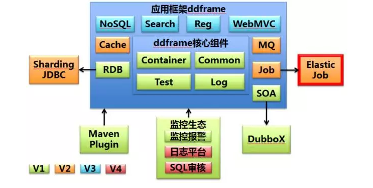 分布式组件包括SOA调用的Dubbox,基于分布式作业的elastic-job,还有刚才提到的sharding-JDBC,以及近期暂无开源计划的缓存、MQ、NoSQL等模块。