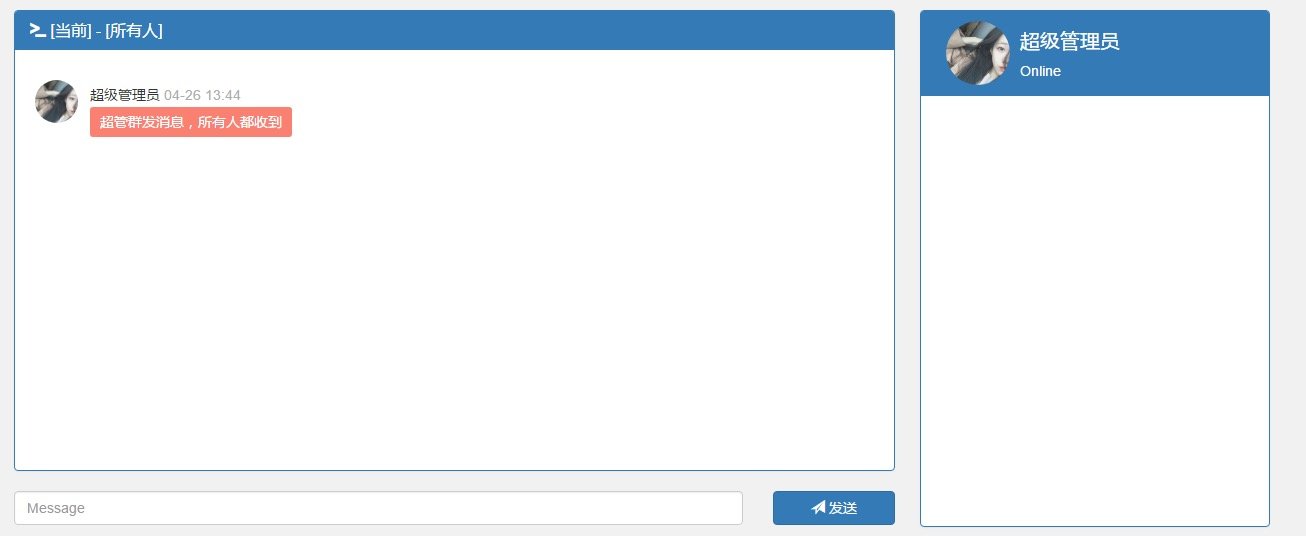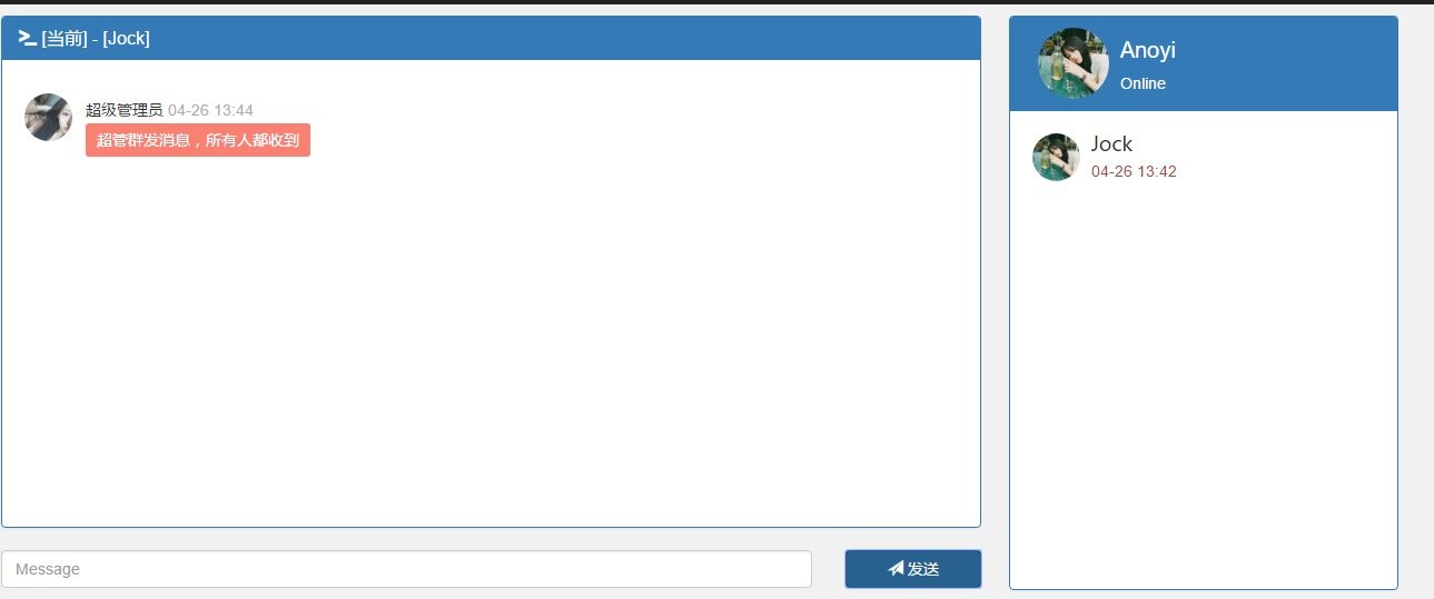 点对点消息测试,Anoyi给Jock发送消息,只有Jock收到消息,Anoyi和超级管理员收不到消息: