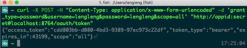 curl -X POST -H "Content-Type: application/x-www-form-urlencoded" -d 'grant_type=password&username=lengleng&password=lengleng&scope=all' "http://appid:secret@localhost:8764/oauth/token"