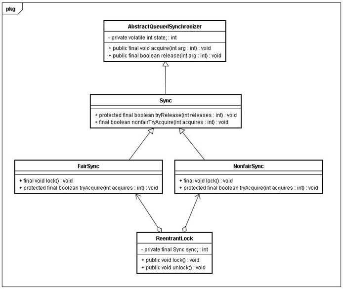 ReentrantLock的实现依赖于java同步器框架AbstractQueuedSynchronizer(本文简称之为AQS)。AQS使用一个整型的volatile变量(命名为state)来维护同步状态,马上我们会看到,这个volatile变量是ReentrantLock内存语义实现的关键。 下面是ReentrantLock的类图(仅画出与本文相关的部分):