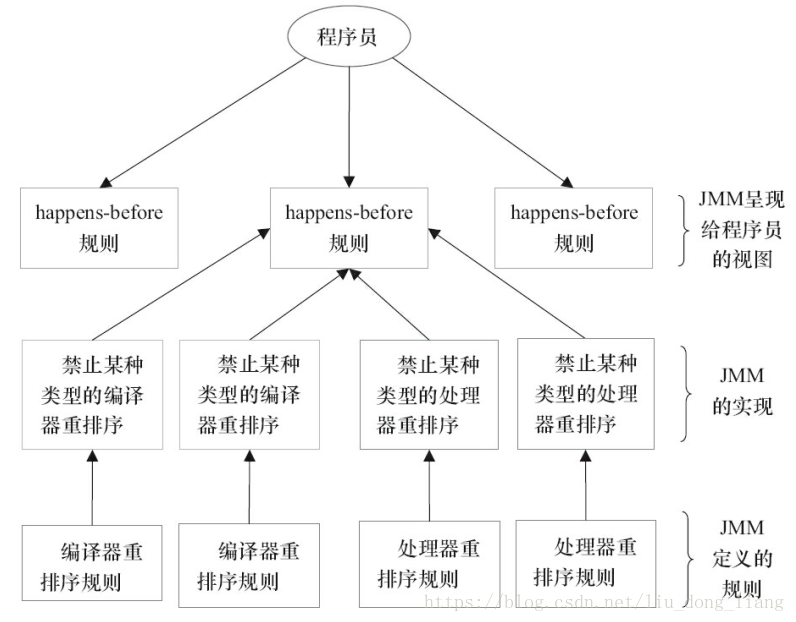 - JMM向程序员提供的happens-before规则能满足程序员的需求。JMM的happens-before规则不但简单易懂,而且也向程序员提供了足够强的内存可见性保证(有些内存可见性保证其实并不一定真实存在,比如上面的A happens-before B)。