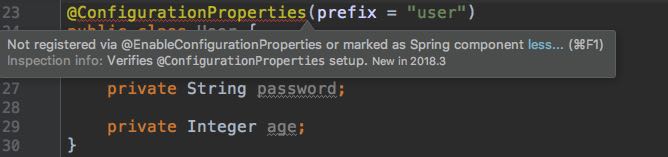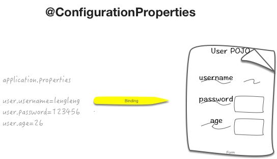 如上图,当配置文件中存在相同组的属性,用户名、密码、年龄 都属于用户属性的抽象,按面向的规则我们可以抽取出一个 User 的PO类型使用 @ConfigurationProperties 将外部配置绑定到代码中的bean。同时可以像其他任何Spring bean一样在整个应用程序代码中注入和使用此bean。