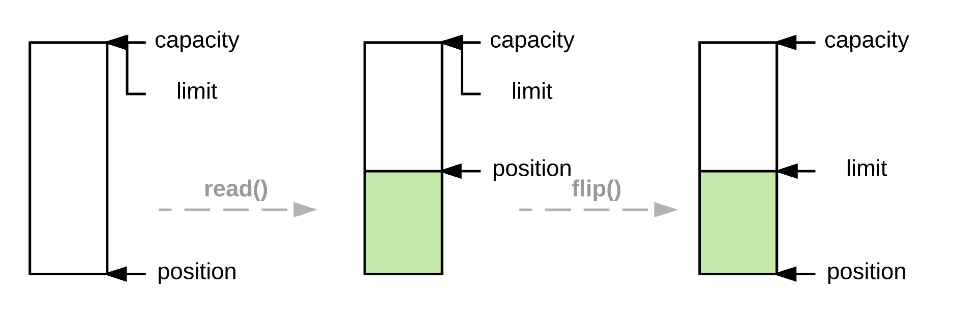 最后,将一下 ByteBuffer 的结构,它主要有 position, limit,capacity 以及 mark 属性。以 buffer.flip(); 为例,讲下各属性的作用(mark 主要是用来标记之前 position 的位置,是在当前 postion 无法满足的情况下使用的,这里不作讨论)。