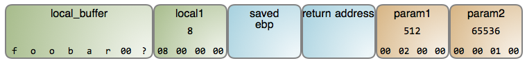 局部变量 local_buffer 是一个字节数组,包含一个由 null 终止的 ASCII 字符串,这是 C 程序中的一个基本元素。这个字符串可以读取自任意地方,例如,从键盘输入或者来自一个文件,它只有 7 个字节的长度。因为,local_buffer 只能保存 8 字节,所以还剩下 1 个未使用的字节。这个字节的内容是未知的,因为栈不断地推入和弹出,除了你写入的之外,你根本不会知道内存中保存了什么。这是因为 C 编译器并不为栈帧初始化内存,所以它的内容是未知的并且是随机的 —— 除非是你自己写入。这使得一些人对此很困惑。