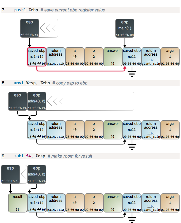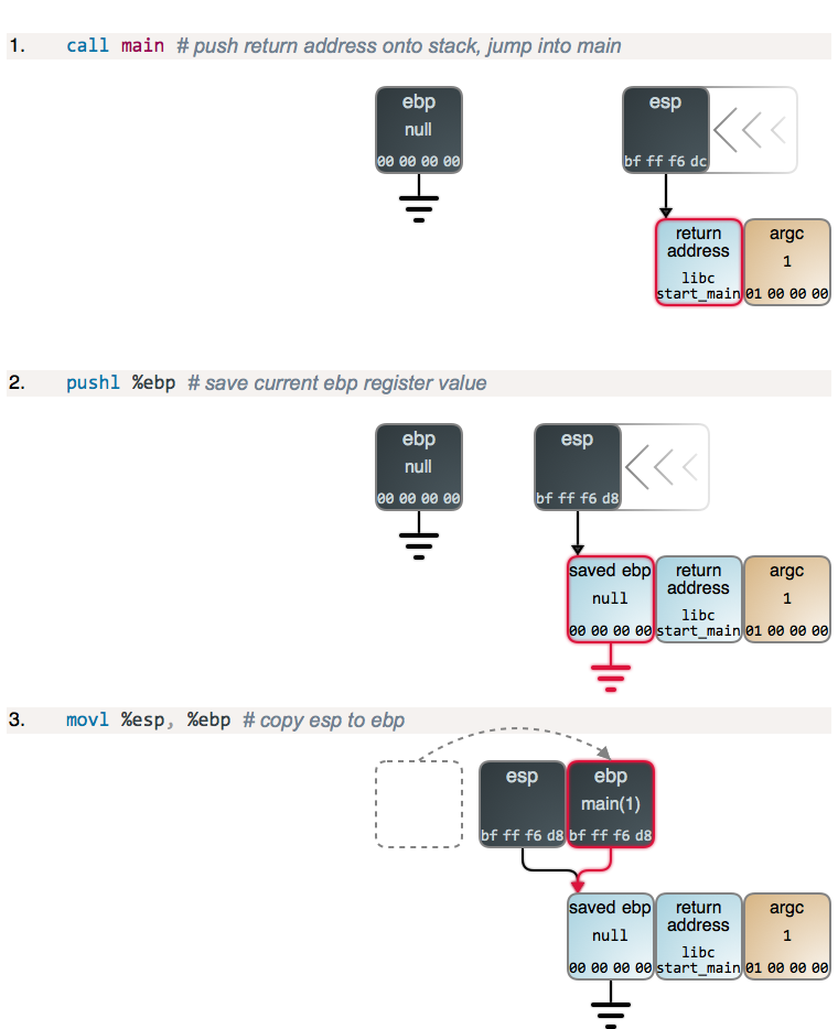 第 2 步和第 3 步,以及下面的第 4 步,都只是函数的序言prologue,几乎所有的函数都是这样的:ebp 的当前值被保存到了栈的顶部,然后,将 esp 的内容拷贝到 ebp,以建立一个新的栈帧。main 的序言和其它函数一样,但是,不同之处在于,当程序启动时 ebp 被清零。