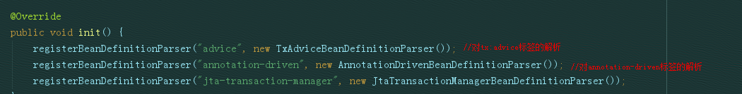 下面我们开始分析Spring的相关源码,首先看一下对tx:annotation-driven标签的解析,这里需要读者对Spring自定义标签解析的过程有一定的了解,笔者后续也会出相关的文章。锁定TxNamespaceHandler:</tx:annotation-driven>