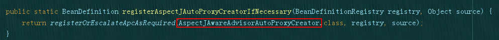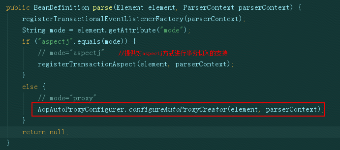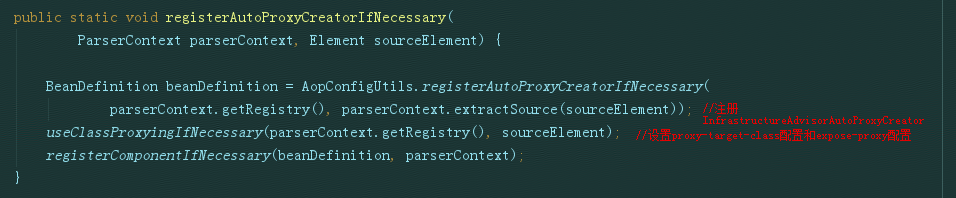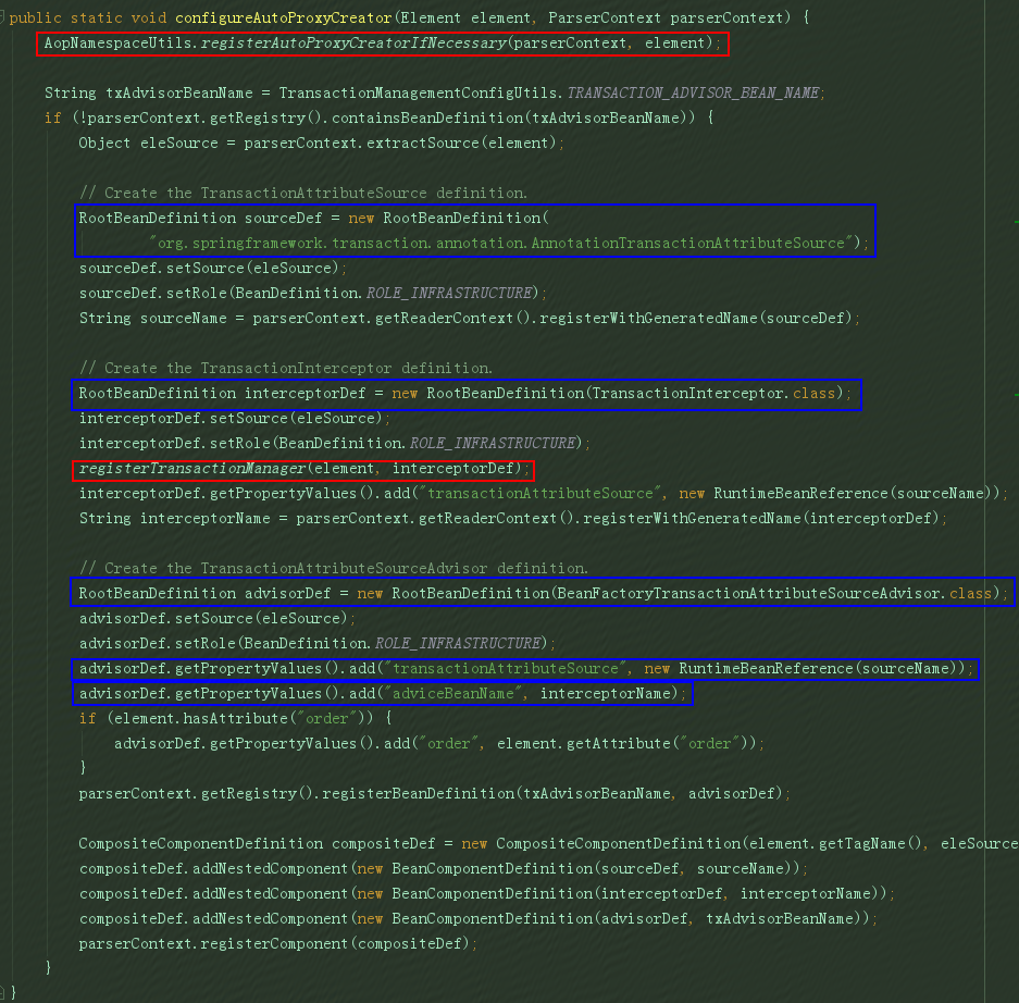 这个方法比较长,关键的部分做了标记,最外围的if判断限制了tx:annotation-driven标签只能被解析一次,所以只有第一次被解析的标签会生效。蓝色框的部分分别注册了三个BeanDefinition,分别为AnnotationTransactionAttributeSource、TransactionInterceptor和BeanFactoryTransactionAttributeSourceAdvisor,并将前两个BeanDefinition添加到第三个BeanDefinition的属性当中,这三个bean支撑了整个事务功能,后面会详细说明。我们先来看红色框的第个方法:</tx:annotation-driven>