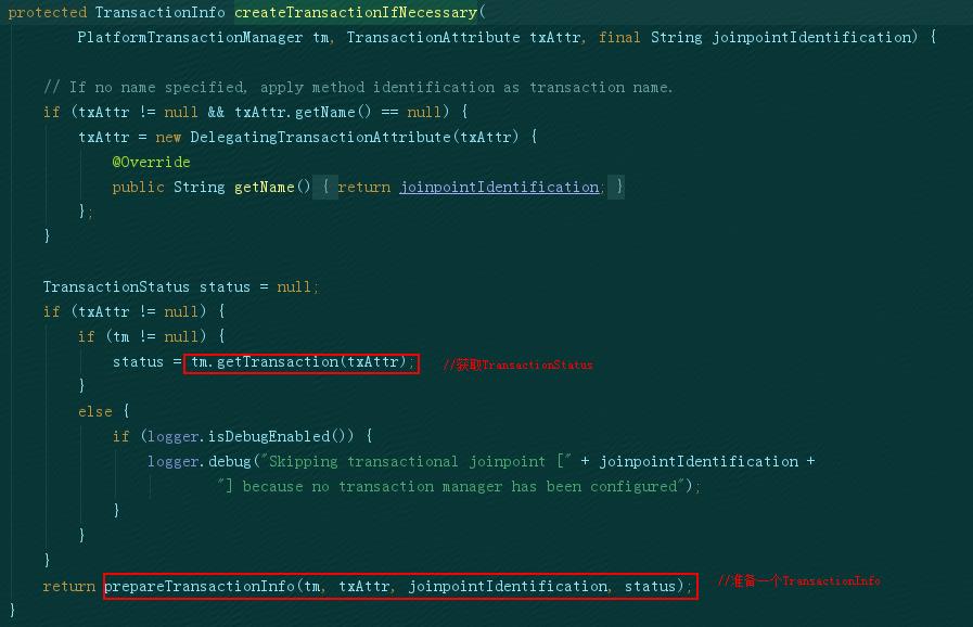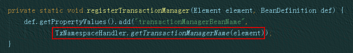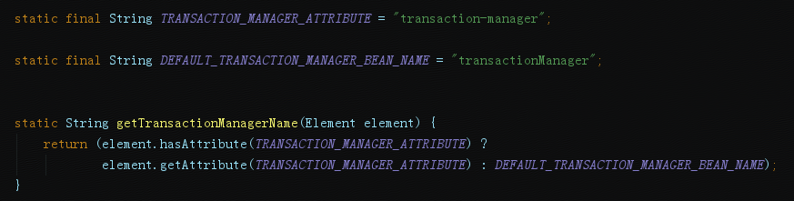 还记得当tx:annotation-driven标签在不指定transaction-manager属性的时候,会默认寻找id固定名为transactionManager的bean作为事务管理器这个注意事项么,就是在这里实现的。下面我们来看红色框的第二个方法:</tx:annotation-driven>