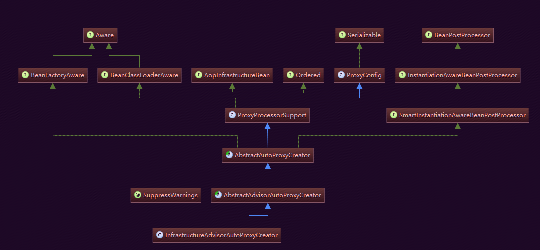 这两个方法的主要目的是注册InfrastructureAdvisorAutoProxyCreator,注册这个类的目的是什么呢?我们看下这个类的层次: