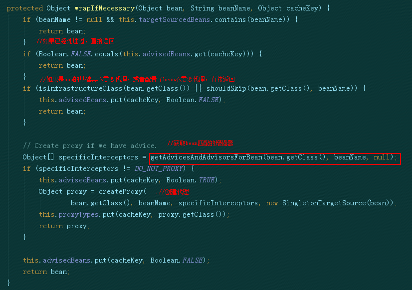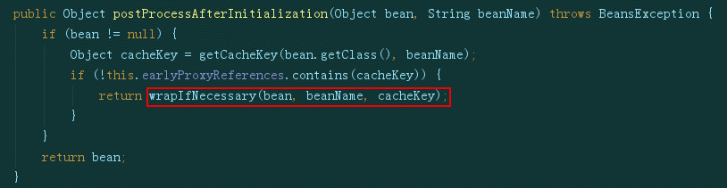 我们发现这个类间接实现了BeanPostProcessor接口,我们知道,Spring会保证所有bean在实例化的时候都会调用其postProcessAfterInitialization方法,我们可以使用这个方法包装和改变bean,而真正实现这个方法是在其父类AbstractAutoProxyCreator类中: