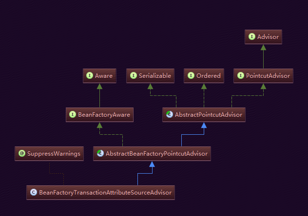 上面这个方法相信大家已经看出了它的目的,先找出所有对应Advisor的类的beanName,再通过beanFactory.getBean方法获取这些bean并返回。不知道大家还是否记得在文章开始的时候提到的三个类,其中BeanFactoryTransactionAttributeSourceAdvisor实现了Advisor接口,所以这个bean就会在此被提取出来,而另外两个bean被织入了BeanFactoryTransactionAttributeSourceAdvisor当中,所以也会一起被提取出来,下图为BeanFactoryTransactionAttributeSourceAdvisor类的层次: