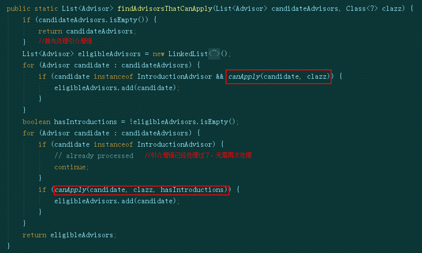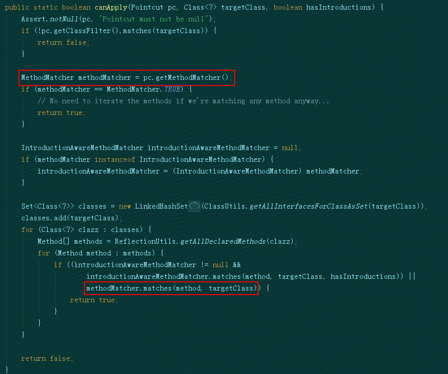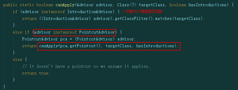 上面的方法中提到引介增强的概念,在此做简要说明,引介增强是一种比较特殊的增强类型,它不是在目标方法周围织入增强,而是为目标类创建新的方法和属性,所以引介增强的连接点是类级别的,而非方法级别的。通过引介增强,我们可以为目标类添加一个接口的实现,即原来目标类未实现某个接口,通过引介增强可以为目标类创建实现该接口的代理,使用方法可以参考文末的引用链接。另外这个方法用两个重载的canApply方法为目标类寻找匹配的增强器,其中第一个canApply方法会调用第二个canApply方法并将第三个参数传为false: