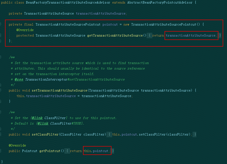 在上面BeanFactoryTransactionAttributeSourceAdvisor类的层次中我们看到它实现了PointcutAdvisor接口,所以会调用红框中的canApply方法进行判断,第一个参数pca.getPointcut()也就是调用BeanFactoryTransactionAttributeSourceAdvisor的getPointcut方法: