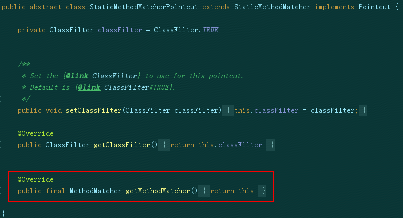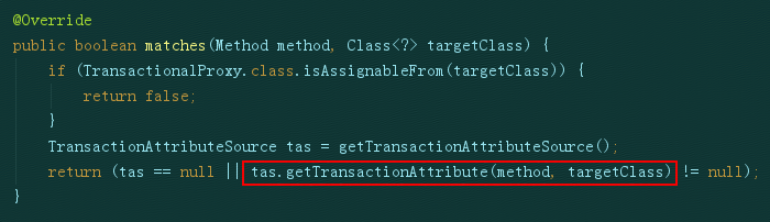发现方法直接返回this,也就是下面methodMatcher.matches方法就是调用TransactionAttributeSourcePointcut的matches方法: