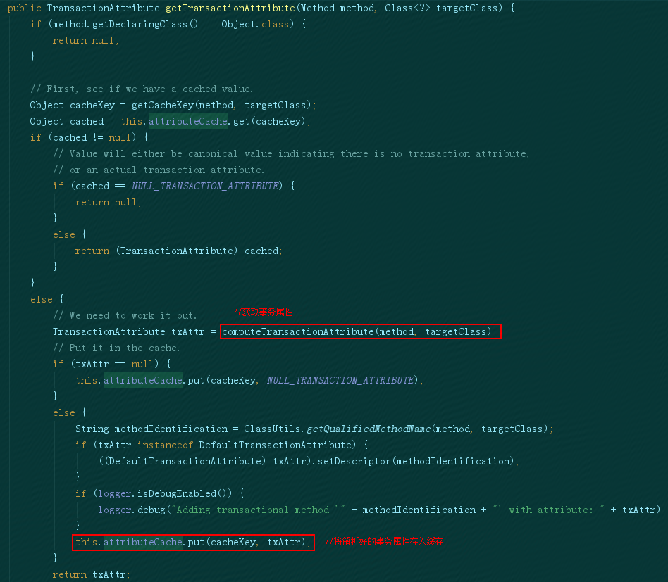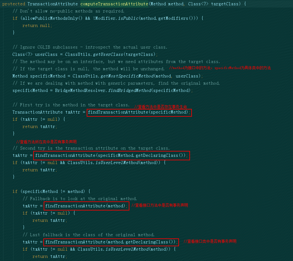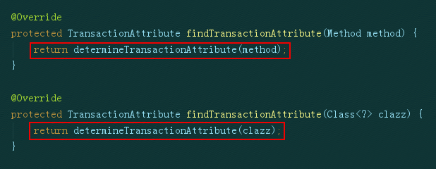 在上面我们看到其实这个tas就是AnnotationTransactionAttributeSource,这里的目的其实也就是判断我们的业务方法或者类上是否有@Transactional注解,跟踪AnnotationTransactionAttributeSource的getTransactionAttribute方法: