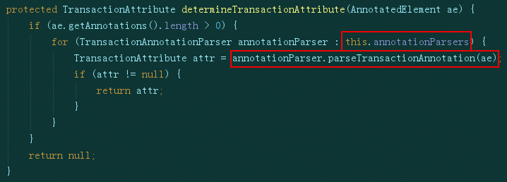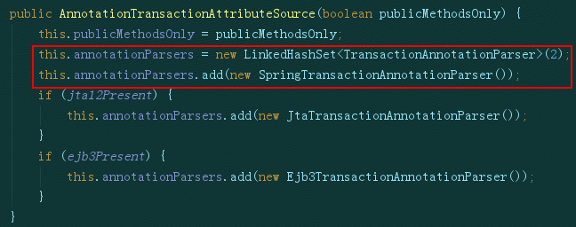 this.annotationParsers是在AnnotationTransactionAttributeSource类初始化的时候初始化的: