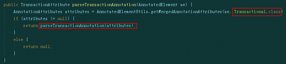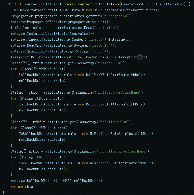至此,我们终于看到的Transactional注解,下面无疑就是解析注解当中声明的属性了: