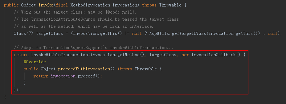 在上文AbstractAutoProxyCreator类的wrapIfNecessary方法中,获取到目标bean匹配的增强器之后,会为bean创建代理,这部分内容我们会在Spring AOP的文章中进行详细说明,在此简要说明方便大家理解,在执行代理类的目标方法时,会调用Advisor的getAdvice获取MethodInterceptor并执行其invoke方法,而我们本文的主角BeanFactoryTransactionAttributeSourceAdvisor的getAdvice方法会返回我们在文章开始看到的为其织入的另外一个bean,也就是TransactionInterceptor,它实现了MethodInterceptor,所以我们分析其invoke方法: