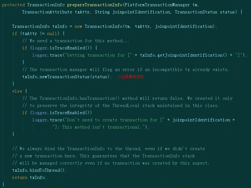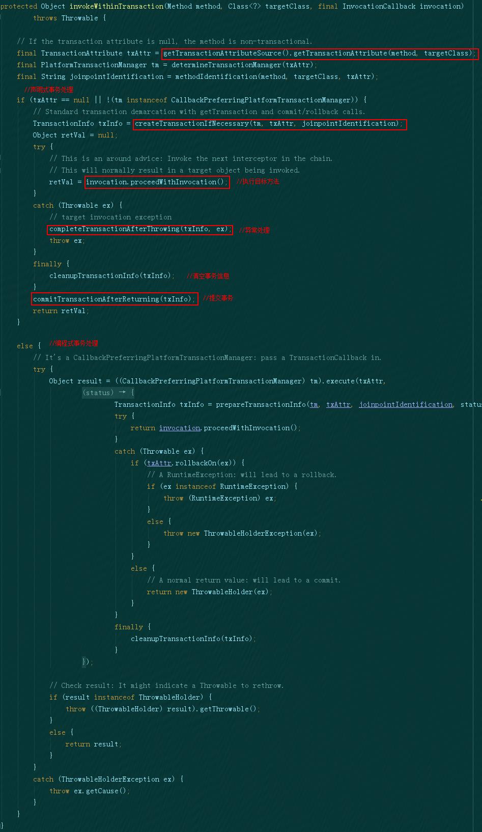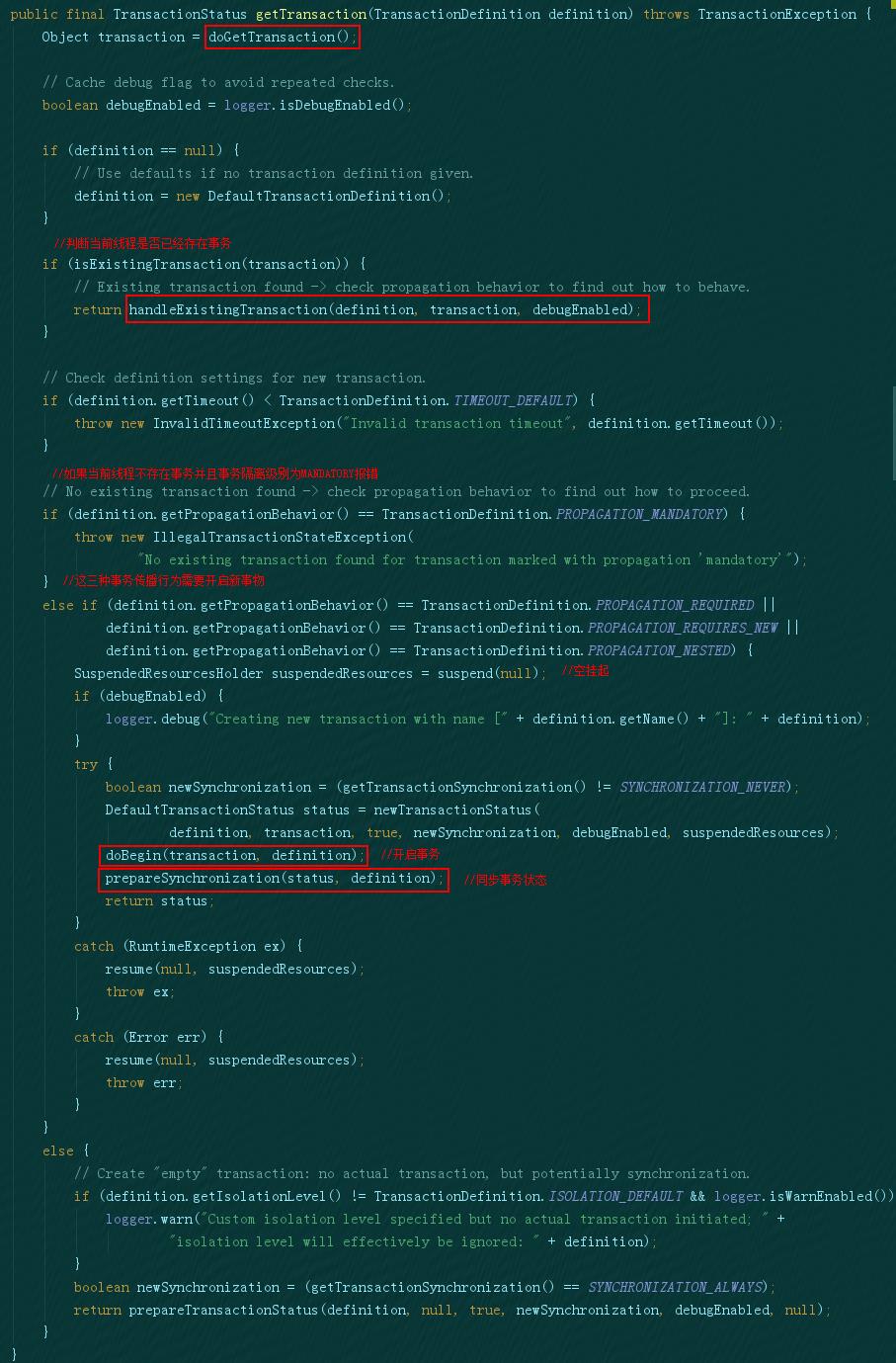 在这个方法中我们看到了在Transactional注解中声明的各种常用或者不常用的属性的解析,至此,事务的初始化工作算是完成了,下面开始真正的进入执行阶段。
