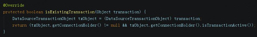 判断当前线程是否存在事务就是判断记录的数据库连接是否为空并且transactionActive状态为true。