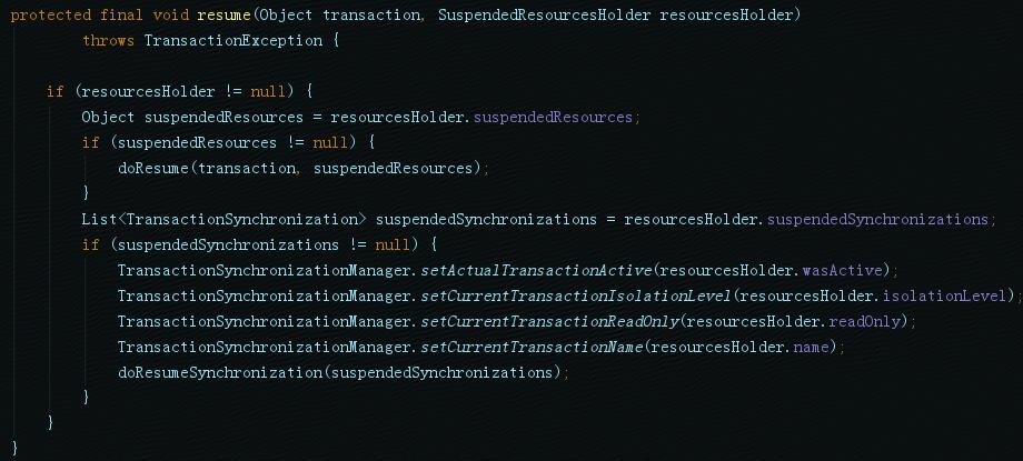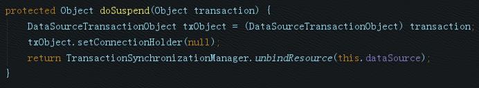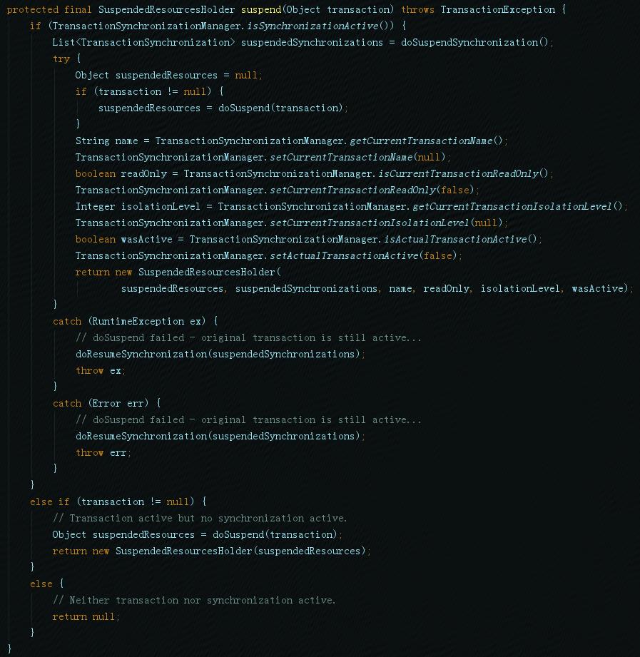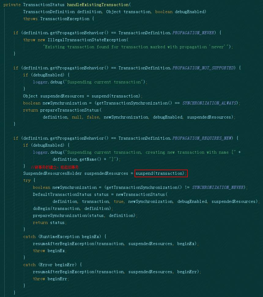 suspend挂起操作主要目的是将当前connectionHolder置为null,保存原有事务信息,以便于后续恢复原有事务,并将当前正在进行的事务信息进行重置。下面我们看Spring如何开启一个新事务: