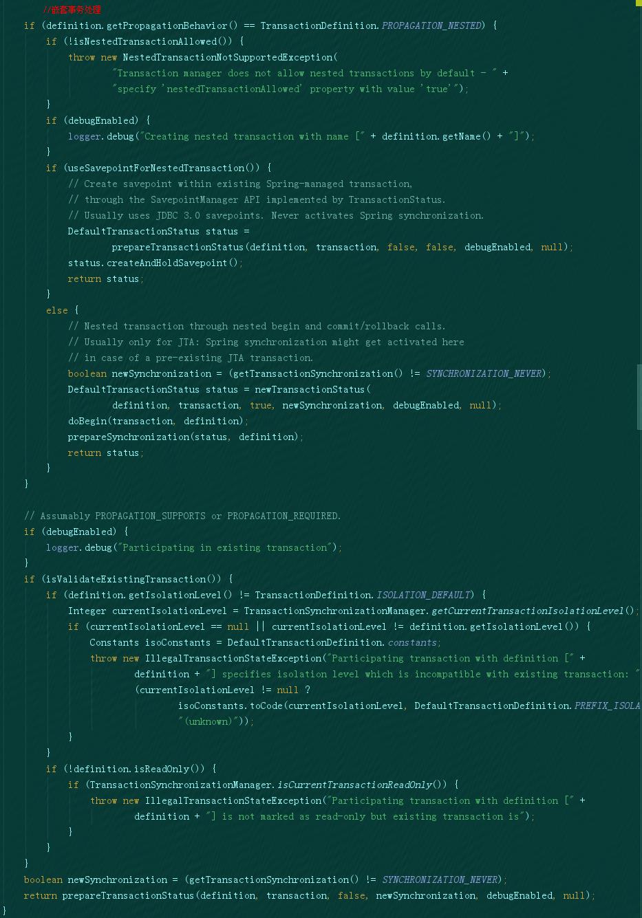 这个方法很长,但是整体逻辑还是非常清晰的,首选获取事务属性,这里的getTransactionAttrubuteSource()方法的返回值同样是在文章开始我们看到的被织入到TransactionInterceptor中的AnnotationTransactionAttributeSource,在事务准备阶段已经解析过事务属性并保存到缓存中,所以这里会直接从缓存中获取,接下来获取配置的TransactionManager,也就是determineTransactionManager方法,这里如果配置没有指定transaction-manager并且也没有默认id名为transactionManager的bean,就会报错,然后是针对声明式事务和编程式事务的不同处理,创建事务信息,执行目标方法,最后根据执行结果进行回滚或提交操作,我们先分析创建事务的过程。在分析之前希望大家能先去了解一下Spring的事务传播行为,有助于理解下面的源码,这里做一个简要的介绍,更详细的信息请大家自行查阅Spring官方文档,里面有更新详细的介绍。
