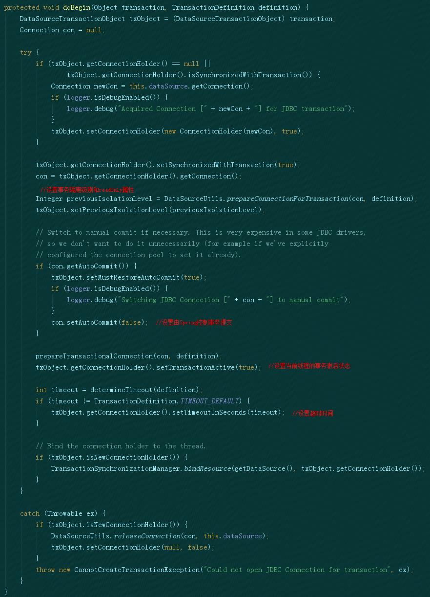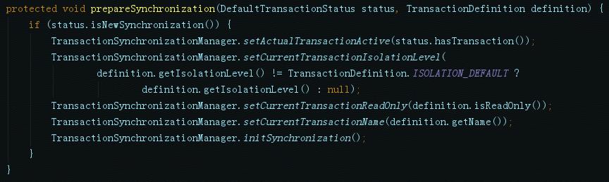 这里我们看到了数据库连接的获取,如果是新事务需要获取新一个新的数据库连接,并为其设置了隔离级别、是否只读等属性,下面就是将事务信息记录到当前线程中: