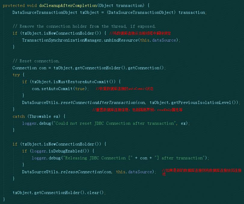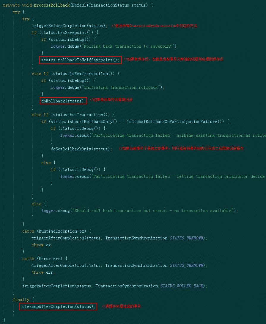 很简单,就是获取当前线程的数据库连接并调用其rollback方法进行回滚,使用的是底层数据库连接提供的API。最后还有一个清理和恢复挂起事务的操作: