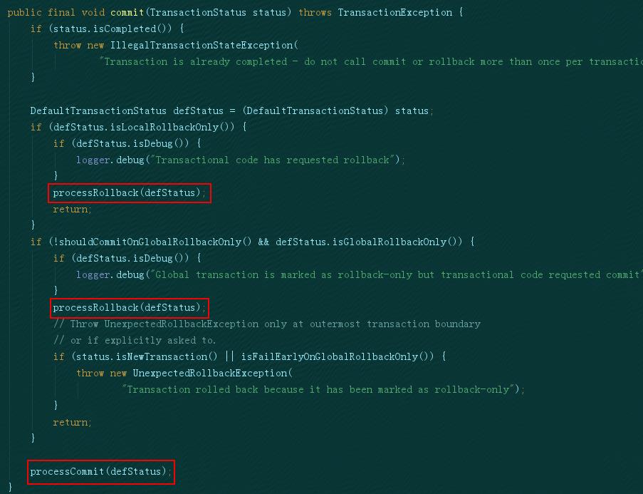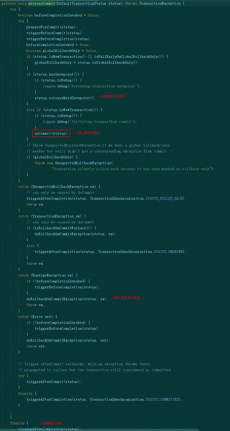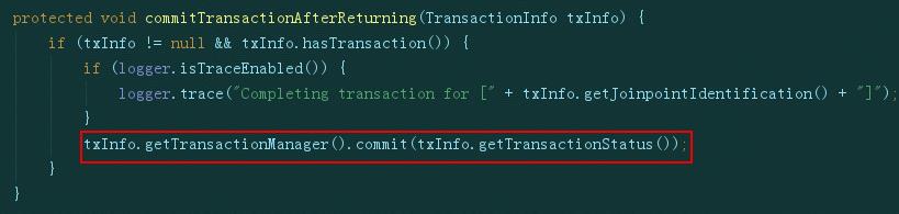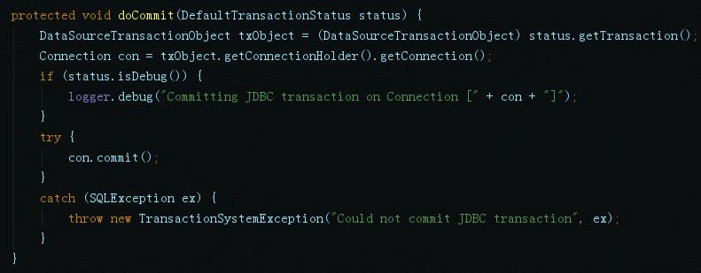 如果事务执行前有事务挂起,那么当前事务执行结束后需要将挂起的事务恢复,挂起事务时保存了原事务信息,重置了当前事务信息,所以恢复操作就是将当前的事务信息设置为之前保存的原事务信息。到这里事务的回滚操作就结束了,下面让我们来看事务的提交操作: