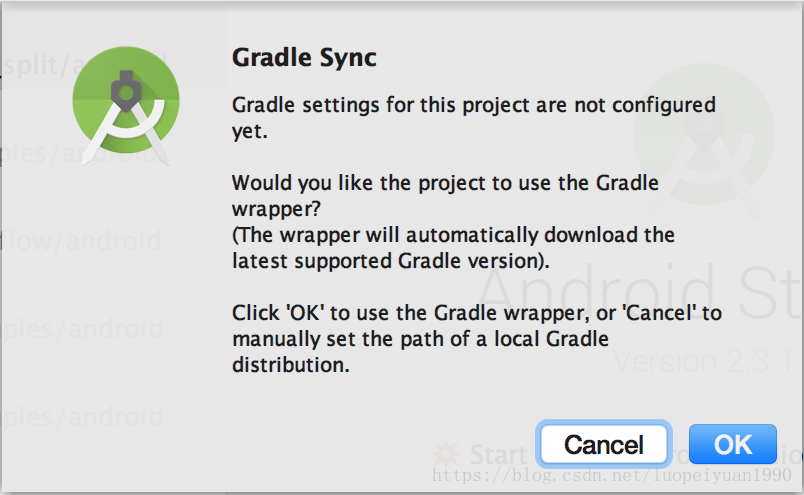 您将在第一次打开项目时收到“Gradle Sync”弹出窗口,询问使用Gradle包装器。点击“确定”。