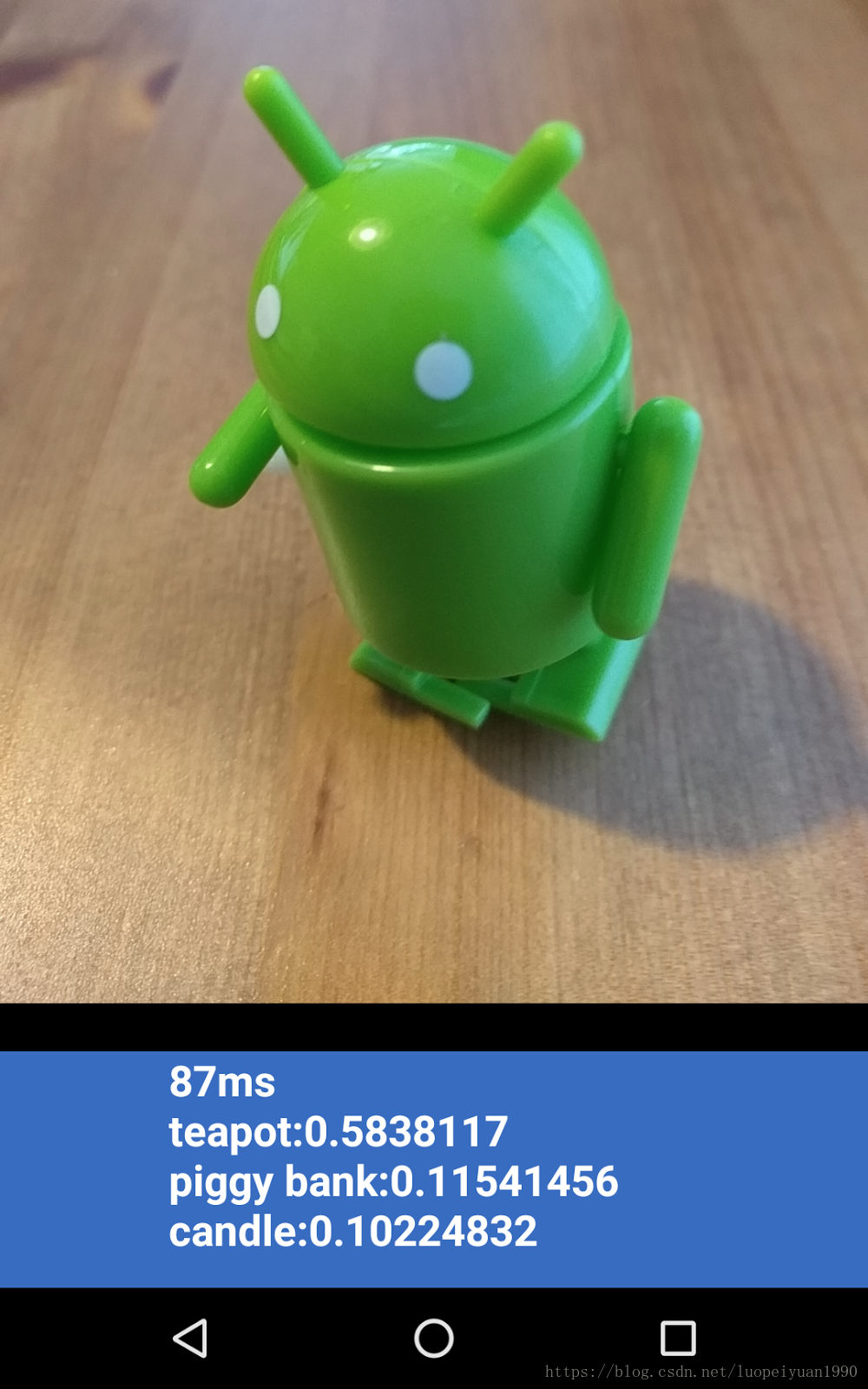 现在,该应用程序已安装,点击应用程序图标启动它。该版本的应用程序使用标准MobileNet,预先在1000个ImageNet类别上进行了培训。它应该看起来像这样(“Android”不是可用的类别之一):