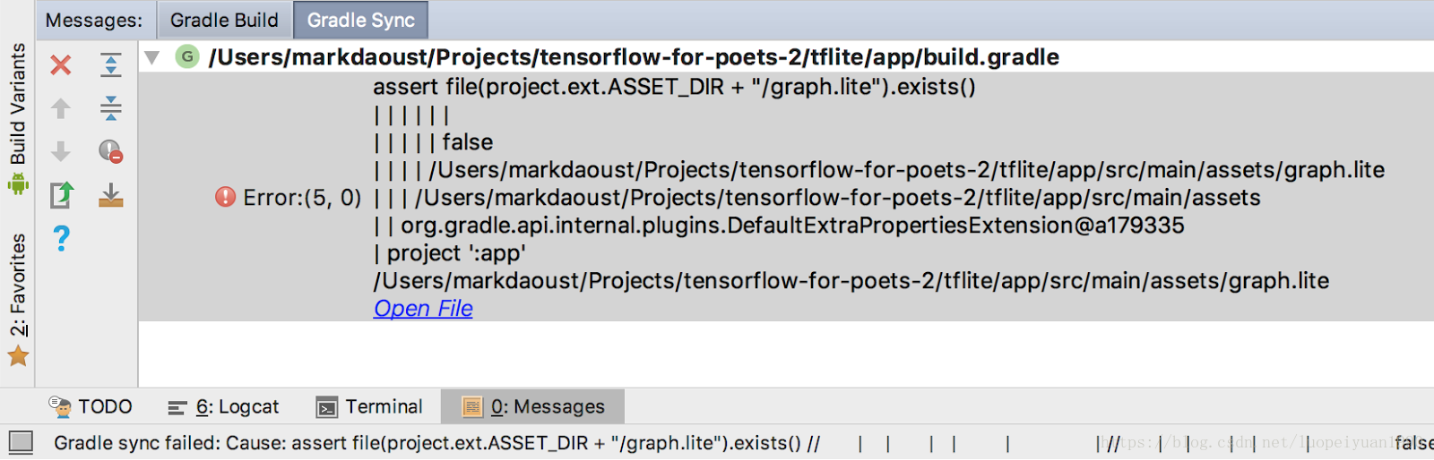 这是因为gradle无法找到graph.lite或labels.txt存档。验证这些文件的位置并通过单击工具栏上的“与Gradle文件同步项目”按钮重新运行Gradle同步: