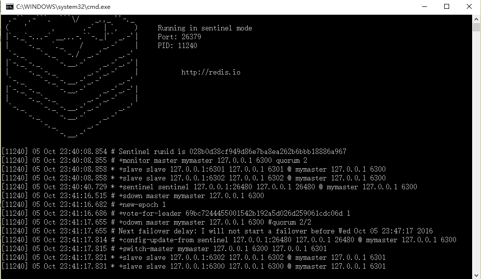 以上两种方式,都必须指定一个sentinel的配置文件sentinel.conf, 如果不指定将无法启动sentinel。sentinel默认监听26379端口,所以运行前必须确定该端口没有被别的进程占用。