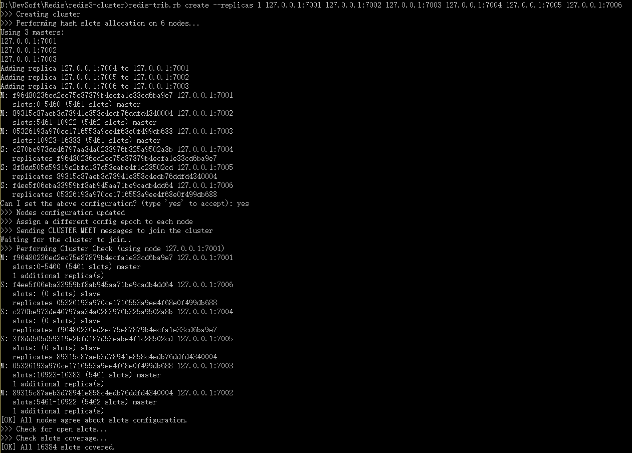 1. redis-trib.rb create --replicas 1 127.0.0.1:7001 127.0.0.1:7002 127.0.0.1:7003 127.0.0.1:7004 127.0.0.1:7005 127.0.0.1:7006