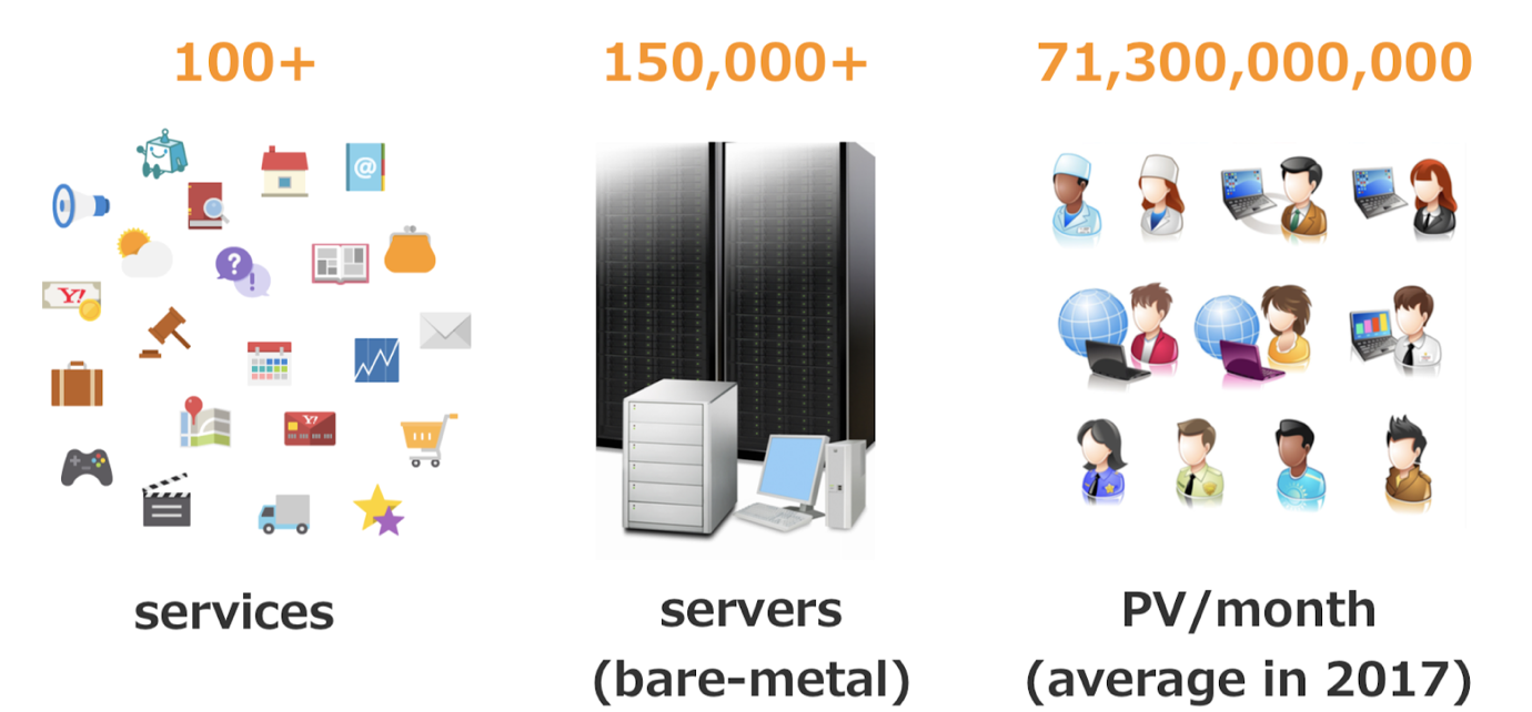 下图从三个维度显示了雅虎日本的经营规模。第一个是服务数量,雅虎日本提供上百种互联网服务;第二个是服务器数量,雅虎日本使用超过 150,000 台服务器(大多为裸机服务器)全天候支持这上百种互联网服务的正常运作;第三个是每月总页面浏览量,2017 年的数据显示,雅虎日本每月浏览量超过 700 亿。由此可见,雅虎日本的服务规模之大。