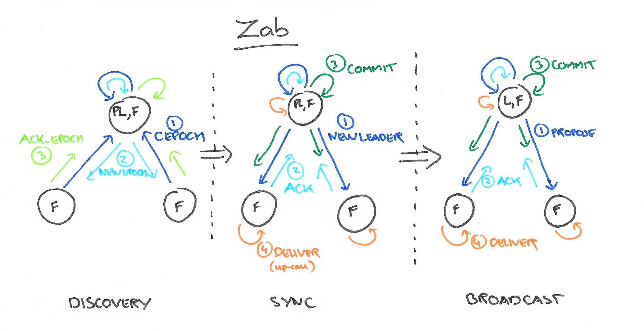 和Raft一样,Zab要求唯一Leader参与决议,Zab可以分解成discovery、sync、broadcast三个阶段: