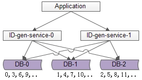 如上图所述,由1个写库变成3个写库,每个写库设置不同的auto_increment初始值,以及相同的增长步长,以保证每个数据库生成的ID是不同的(上图中库0生成0,3,6,9…,库1生成1,4,7,10,库2生成2,5,8,11…)