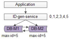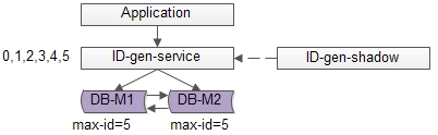 如上图所述,数据库使用双master保证可用性,数据库中只存储当前ID的最大值,例如0。