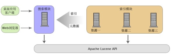 如果我们想要实现搜索引擎,最重要的是索引模块和搜索模块。索引模块在不同的机器上各自进行对资源的索引,并把索引文件统一传输到同一个地方(可以是在远程服务器上,也可以是在本地)。搜索模块则利用这些从多个索引模块收集到的数据完成用户的搜索请求。因此,我们可以理解两个模块之间相对是独立的,它们之间的关联不是通过代码,而是通过索引和元数据,如下图所示。