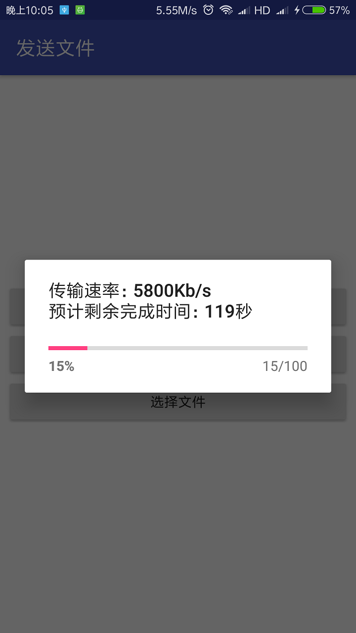 连接到指定Wifi后,在选择了要发送的文件后,就启动一个后台线程去主动请求连接服务器端,然后就是进行实际的文件传输操作了