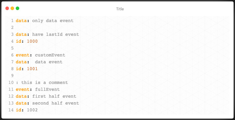 第1行表示一个只包含数据的事件。会按照默认事件走(message事件)。第3-4代表一个附带eventID的事件。第6-8代表一个自定义事件。第10-14代表一个多行数据事件,多行数据由换行符链接