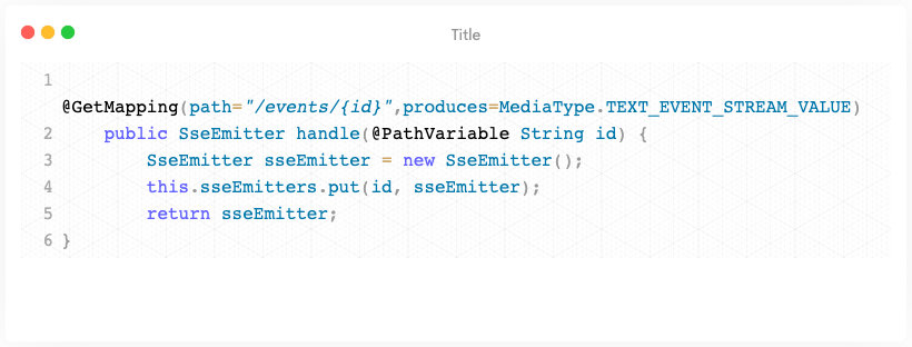 Spring Mvc对SSE进行了支持。如果你要声明一个SSE连接。只需要在你的控制器声明一个如下接口: