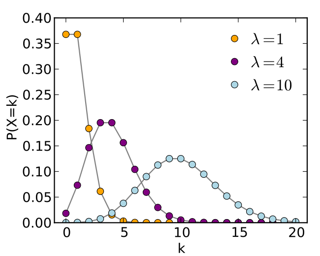 对着上述图像解释,每个点的意义就是单位时间或面积内随机事件发生k次的概率。