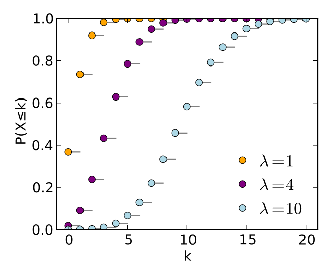 对着上述图像解释,每个点的意义就是单位时间或面积内随机事件发生次数小于等于k次的概率。